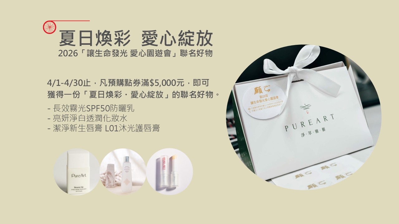4/1-4/30止,凡預購點券滿$5,000元,即可獲得一份夏日煥彩・愛心綻放」聯名好禮。